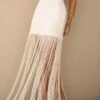 Conjunto confeccionado em malha rilievo, composto por top modelo tomara que caia, possui detalhe de aplicação de aviamento dourado no centro do decote, bojos e elástico nas costas. Saia possui elástico na cintura, forro, aplicação de franjas longas e acetinadas na barra, shape justo e caimento reto.