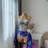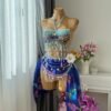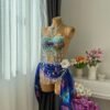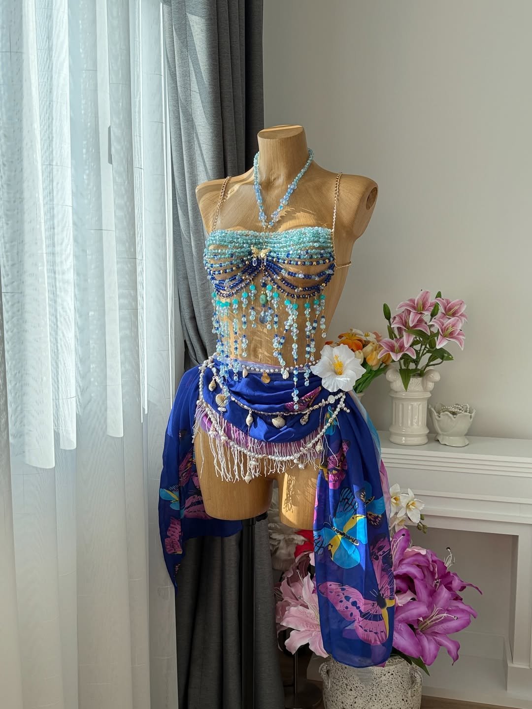 Conjunto inspirado na beleza do oceano, com top em pérolas azuis degradê e franjas brilhantes que criam um efeito luxuoso e hipnotizante. A saia em tons de azul com estampas marinhas e detalhes em conchas traz movimento, leveza e um visual mágico — perfeito para performances, ensaios fotográficos e figurinos artísticos.