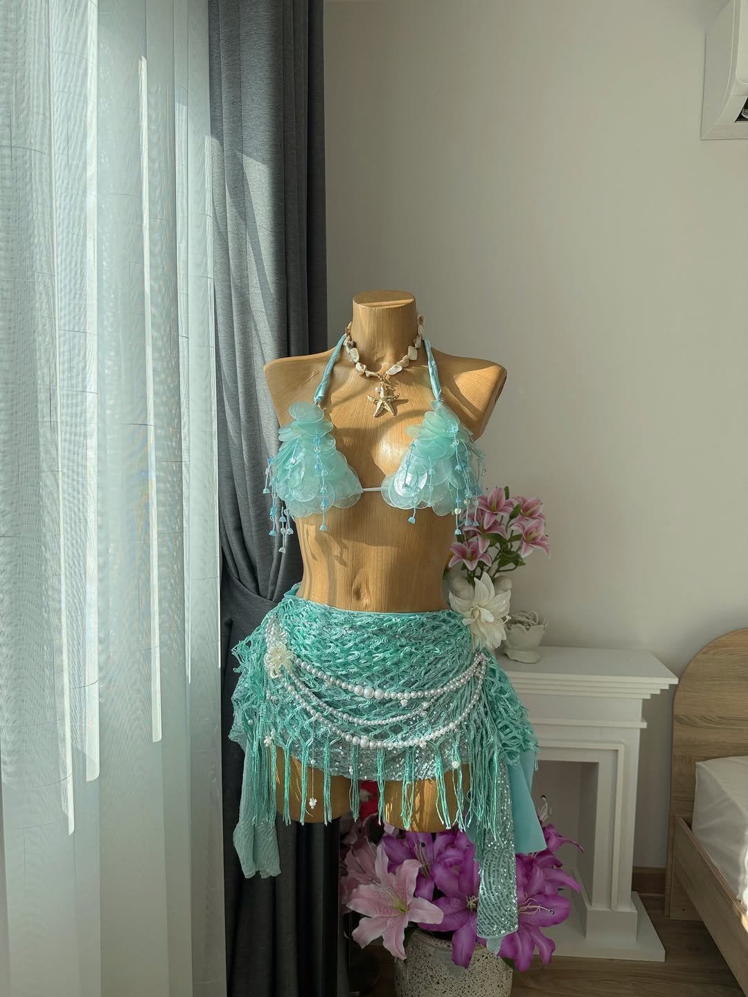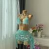 O Conjunto Turquesa Sereia do Mar traz a magia do oceano em cada detalhe. O top é confeccionado com camadas delicadas de aplicações translúcidas em tom turquesa, criando um efeito de conchas suaves, com pequenos pingentes que acompanham os movimentos com leveza e brilho sutil.