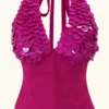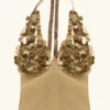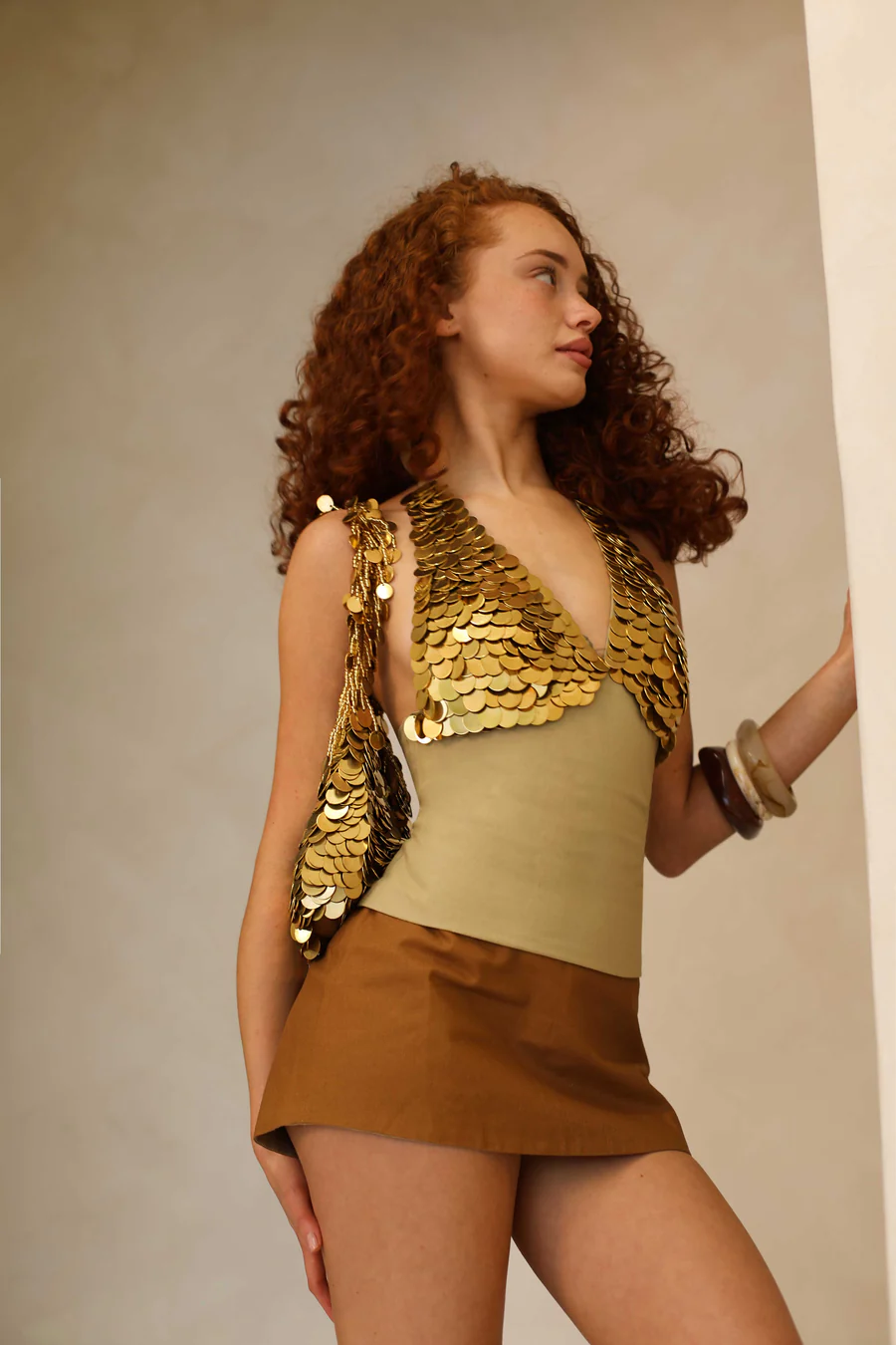 O top Siren é um modelo frente única com decote profundo, confeccionado em algodão cor marfim com amarração nas costas estilo corset e adornado com miçangas de conchas naturais bordadas à mão que cobrem todo o busto.